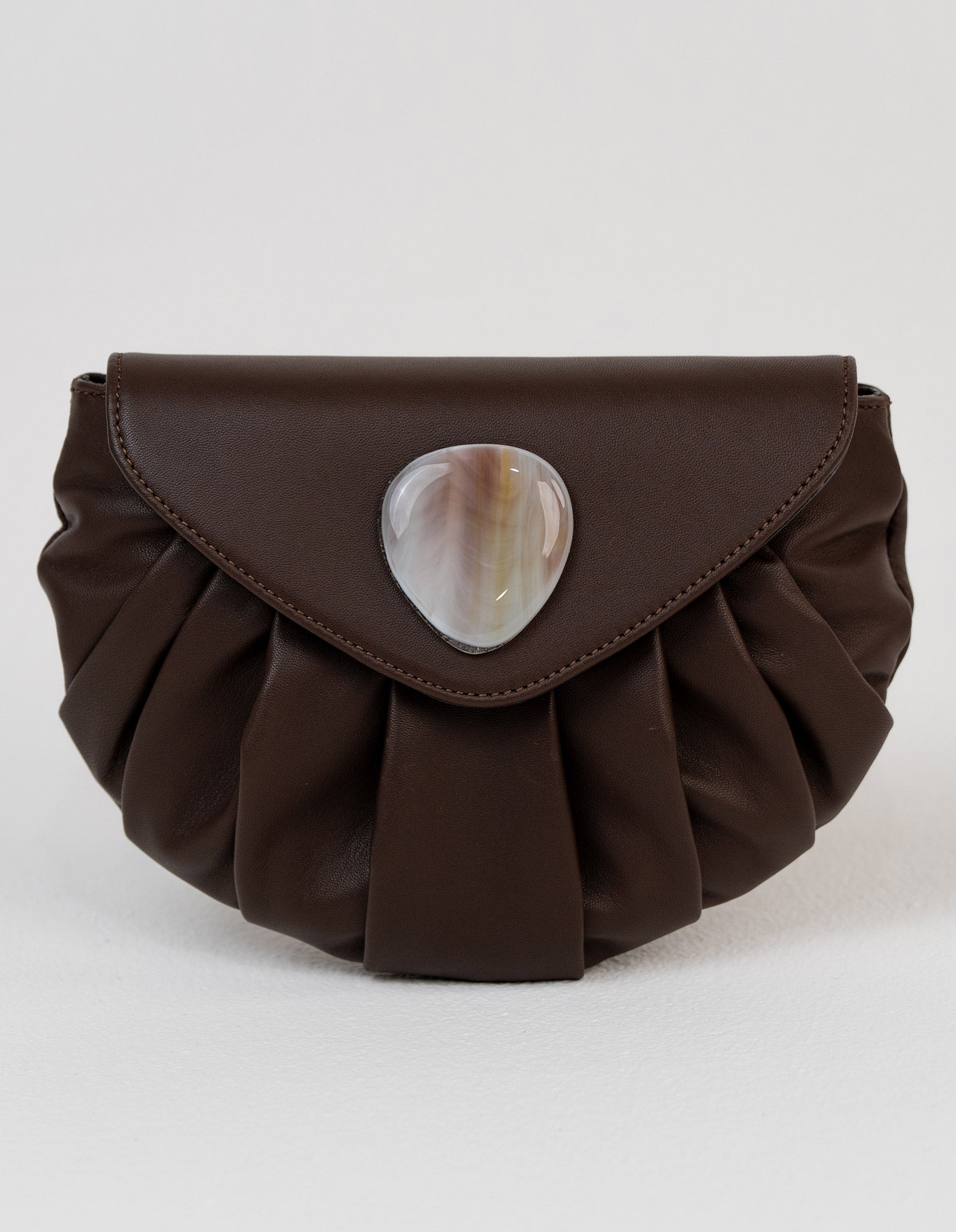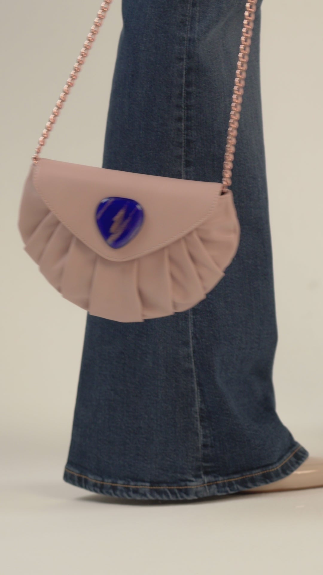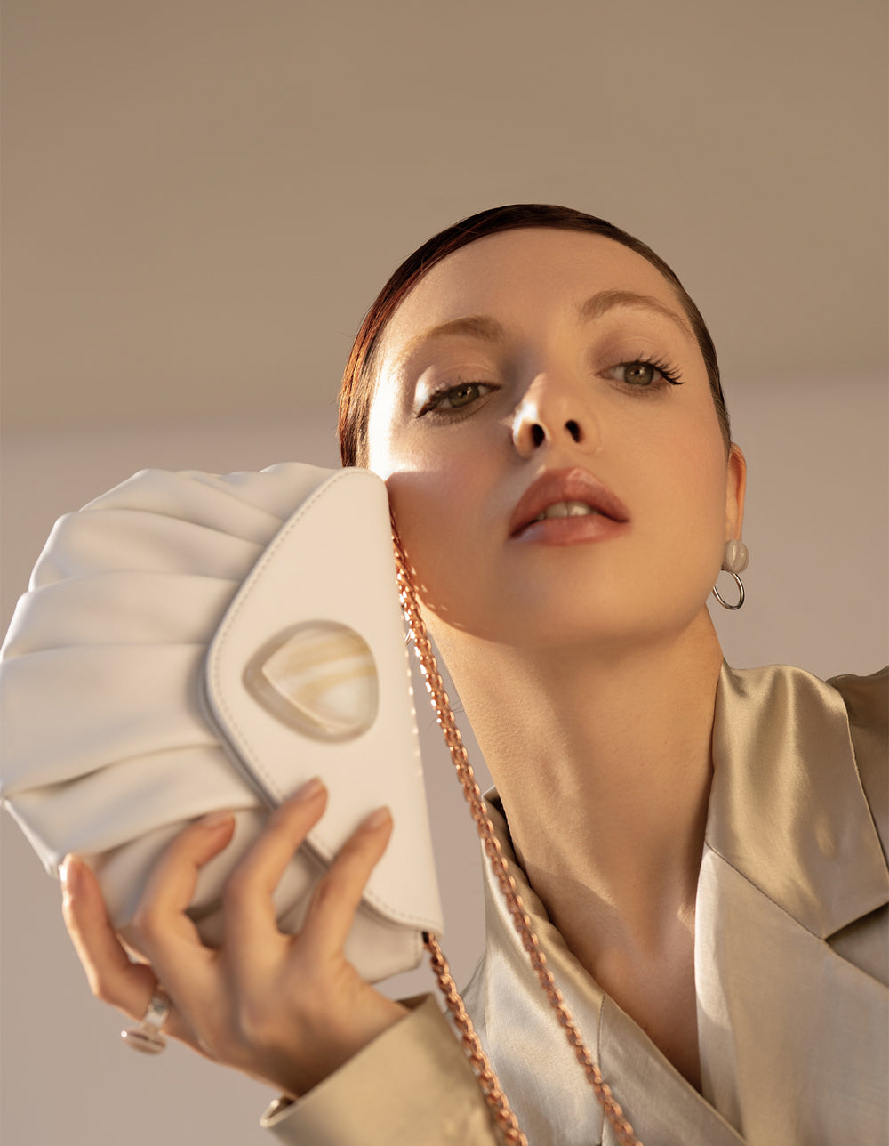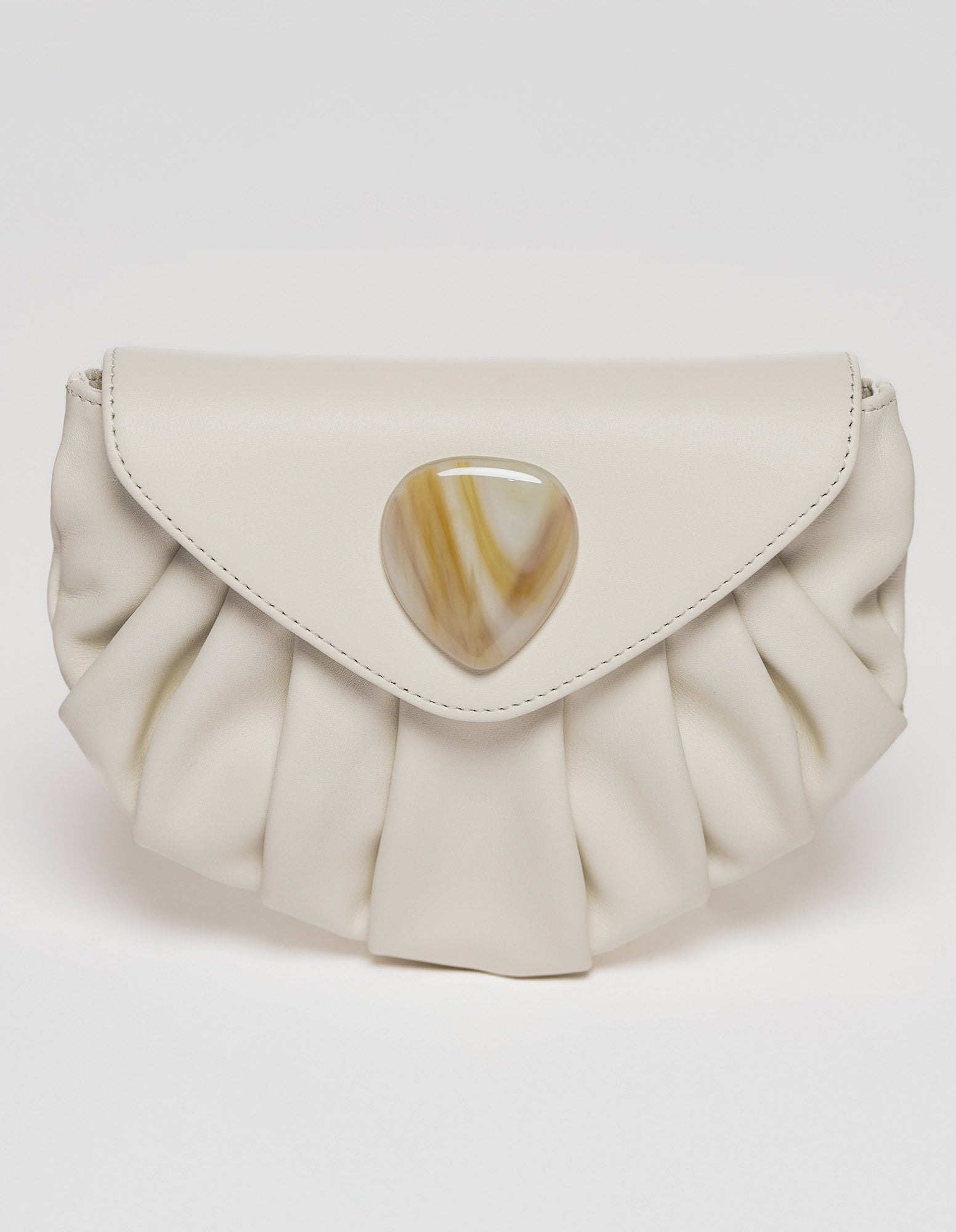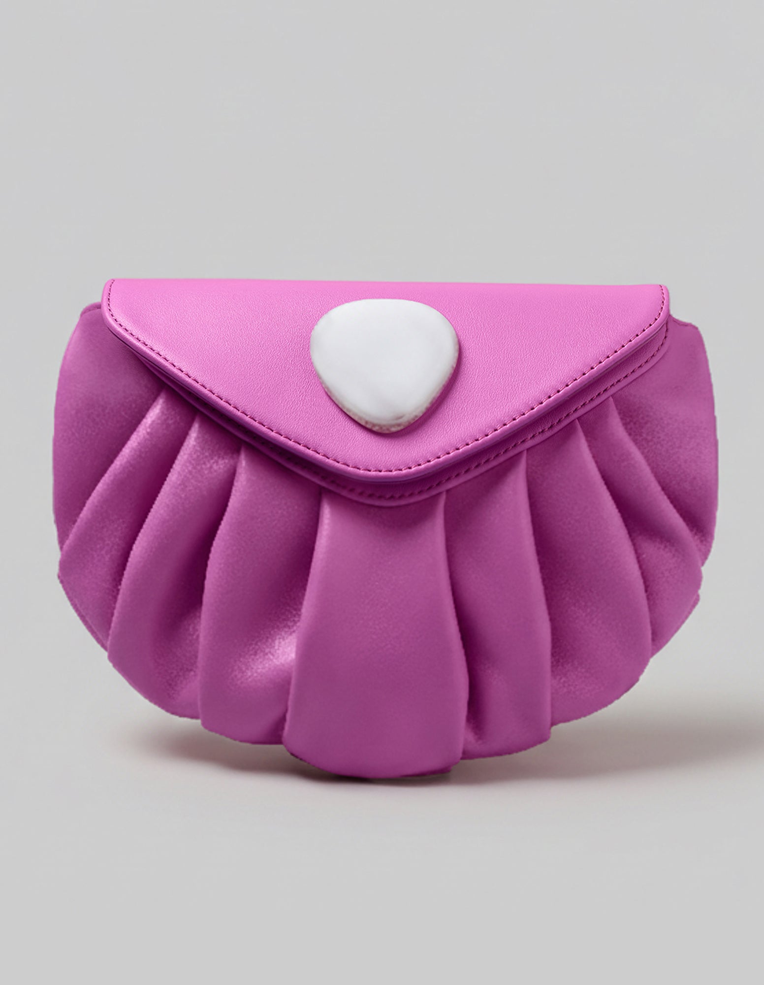 Una borsa soffice da abbracciare, dalla forma a conchiglia delicata e sinuosa, che seduce con linee morbide che ricordano il mare.